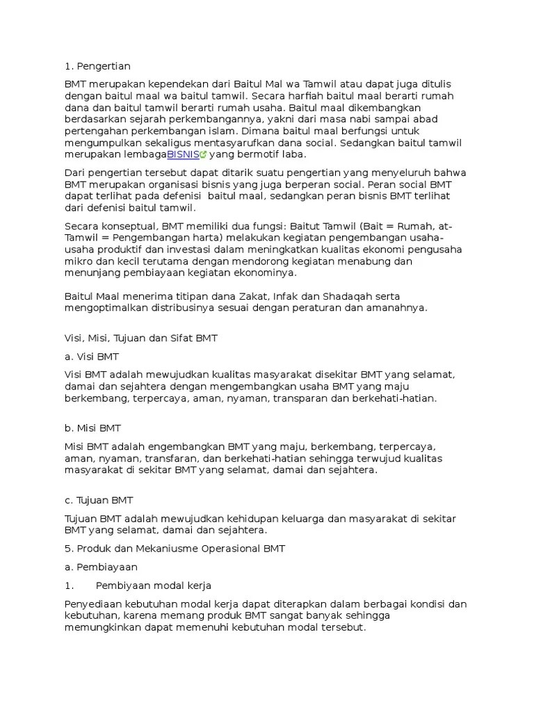 Pengertian bmt baitul mal wa tamwil (bmt) terdiri dari dua istilah, yaitu baitul mal dan baitut tamwil. Bmt merupakan lembaga keuangan mikro dengan prinsip syariah yang mempunyai karakteristik khusus yaitu baitul maal yang mengandung nilai sosial dimana menghimpun dana dan oleh karena itu, perlu dikaji aspek regulasi yang mengatur bmt dalam sistem perekonomian indonesia. Baitul maal wa tamwil (bmt) merupakan lembaga keuangan mikro berbasis syariah (islam). Panduan praktis operasional baitul mal wat tamwil (bmt), (bandung Bmt sebagai lembaga non perbankan memiliki berbagai macam produk yang dapat memberikann manfaat kepada anggota atau nasabah.